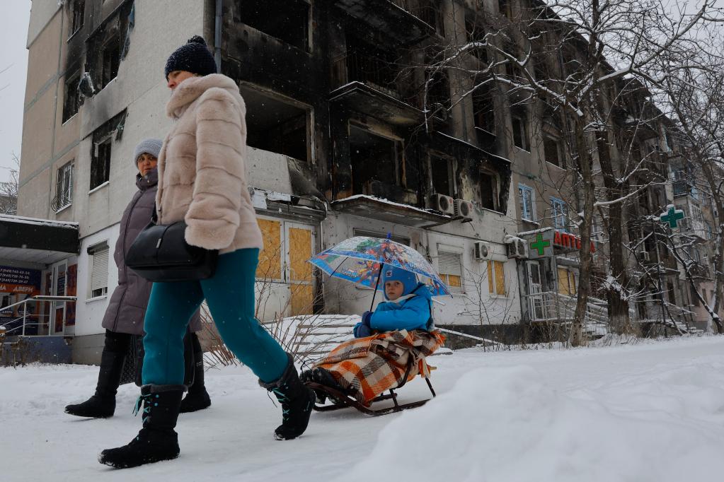 2月18日,在马里乌波尔,人们走过被损坏的建筑。新华社发(维克托摄)