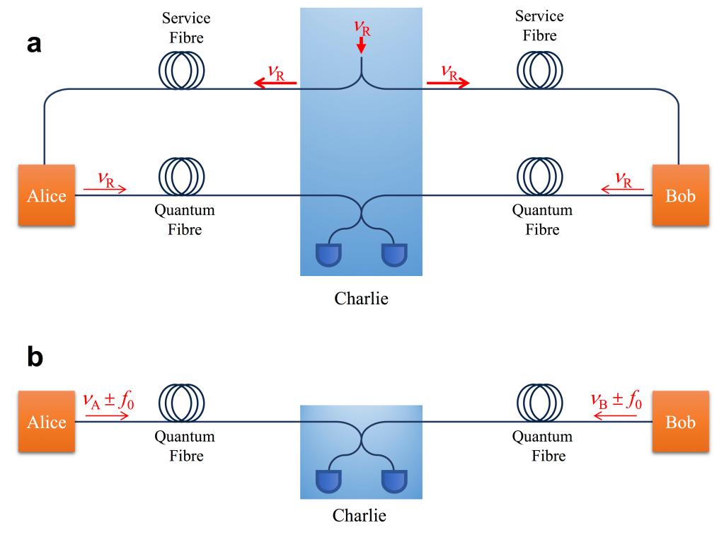 北京量子信息科学研究院首席科学家袁之良介绍,双场架构下量子通信,需要相距遥远的两个独立激光源各自发出“信号”。如果激光源发射的“信号”频率不同,就会出现传输中的“信号”失误。想要避免“信号”失误,就需要一个能实现两端“信号”频率相同的“工具”:服务光纤。这意味着通信两端之间还需额外架设“一条路”,这也就构成了由“两条路”构成的传统架构。