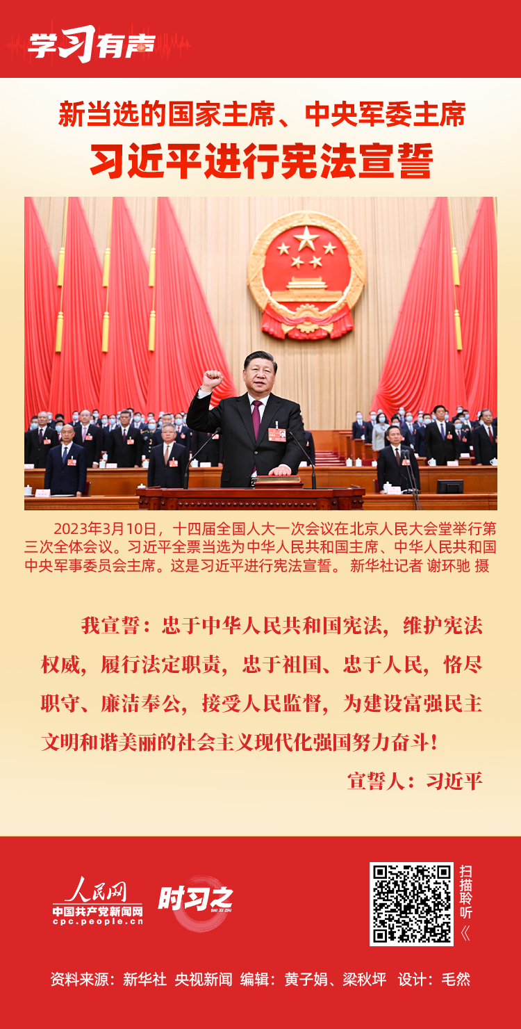 新当选的国家主席、中央军委主席习近平进行宪法宣誓