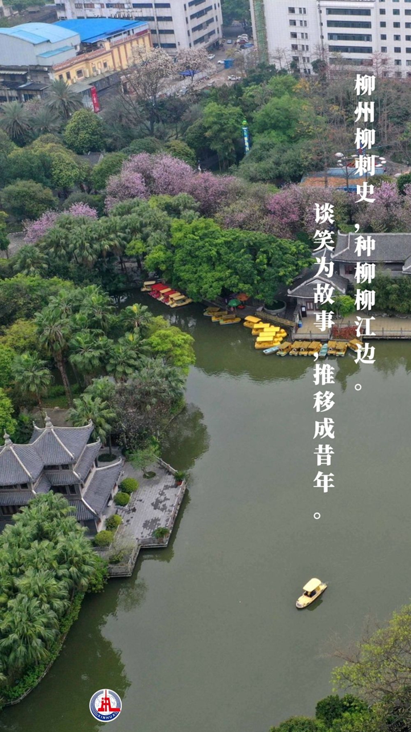 “唐宋八大家”之一的柳宗元在柳州任职时,兴利除弊,十分重视种植树木,推行“柳州植柳”,他还写过一首《种柳戏题》,开头就拿自己的姓氏开涮,首联一口气用了四个柳字。今日柳州,青山环绕,水抱城流,一如柳宗元诗中所写“岭树重遮千里目,江流曲似九回肠”。