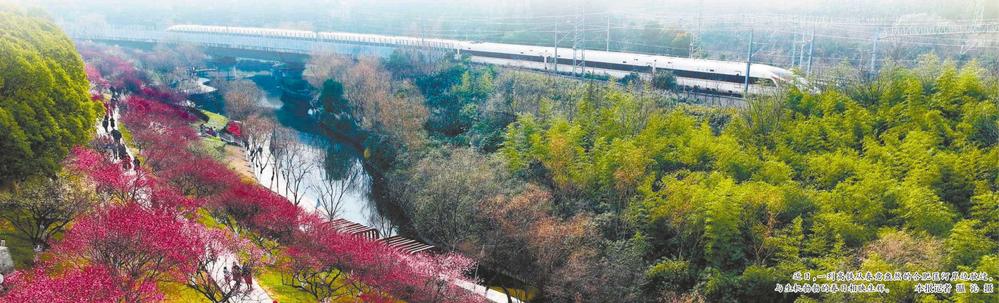 近日,一列高铁从春意盎然的合肥匡河岸边驶过,与生机勃勃的春日相映生辉。 记者 温 沁 摄