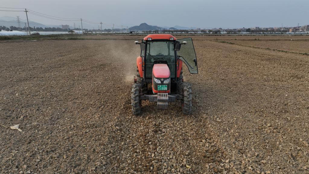 3月14日,在福建惠安一片田地上,无人驾驶拖拉机在进行耕地作业(无人机照片)。新华社记者 周义 摄
