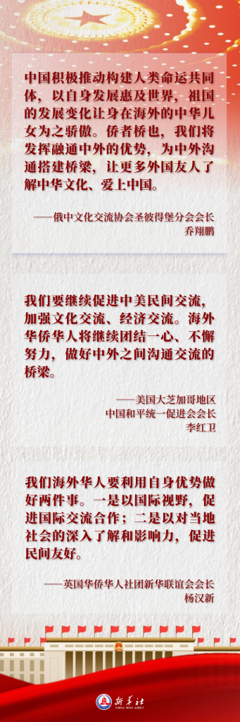 “作为身在海外的中华儿女,我们要身体力行成为民间外交的友好使者。”赞比亚华侨华人总会会长张键说,华侨华人是海外代表中国形象的一个重要群体,应积极参与当地社会和经济建设,努力拓展中外交流合作渠道和平台,以中华文明兼容并蓄的智慧和格局,做好中国与世界沟通的桥梁,为世界和平发展传递正能量,为推动构建人类命运共同体贡献力量。(综合新华社驻外记者报道,执笔记者:何毅、王雅楠、杨威)