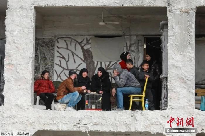 资料图:叙利亚阿勒颇,民众坐在被地震破坏的建筑物里喝咖啡,这栋楼房在强震中已经成为“镂空”的状态。