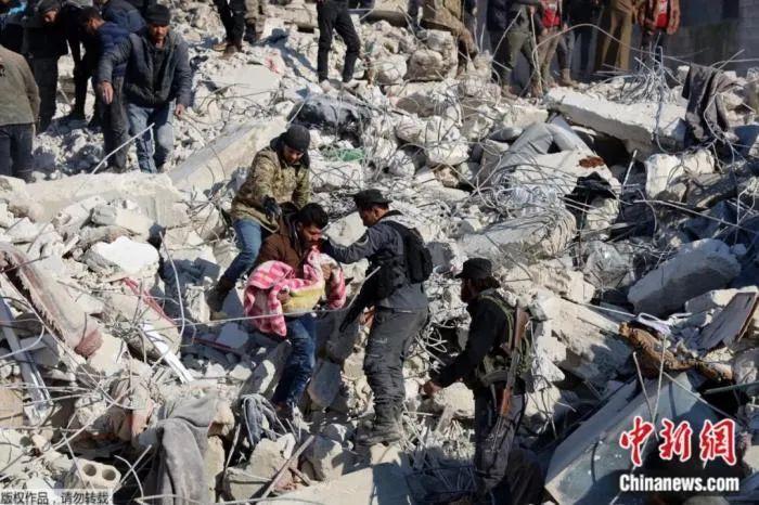 2023年2月8日,叙利亚伊德利卜省,一名男子从废墟中抱出一名儿童的遗体。