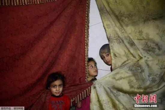 2018年3月11日,叙利亚大马士革东南部郊区小镇杜马,镇上的孩子们在房梁变形的避难所中生活。