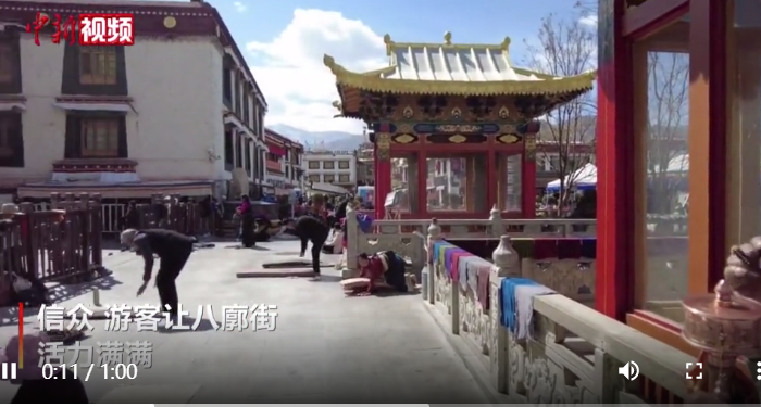 3月14日,西藏拉萨八廓街上,磕长头、转经的信众和游览拍摄的游客让这条千年古街活力满满。3月的高原大地,处处可见春天的气息,市民、游客各得其乐。(李林 制作 乐小敏)