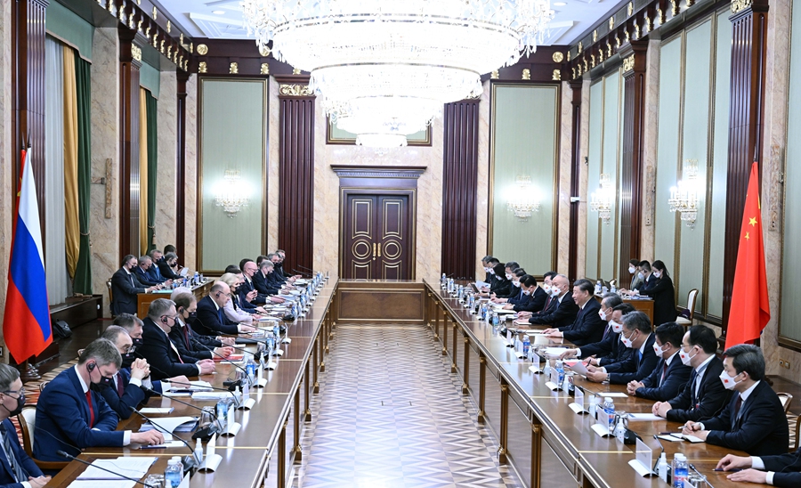 当地时间3月21日上午,国家主席习近平在俄罗斯联邦政府大厦会见俄罗斯总理米舒斯京。新华社记者 张领 摄