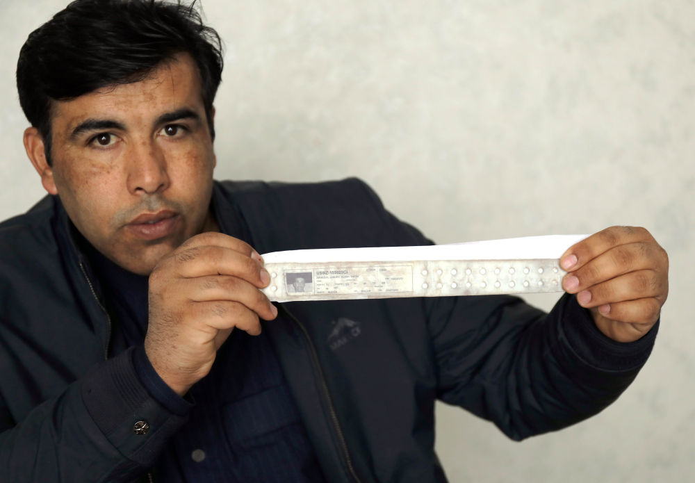 2月17日,在伊拉克北部萨拉赫丁省祖卢耶镇,阿拉·卡里姆·艾哈迈德展示他在被关押期间所戴的印有个人照片和信息的身份识别手环。新华社发(哈利勒·达伍德摄)