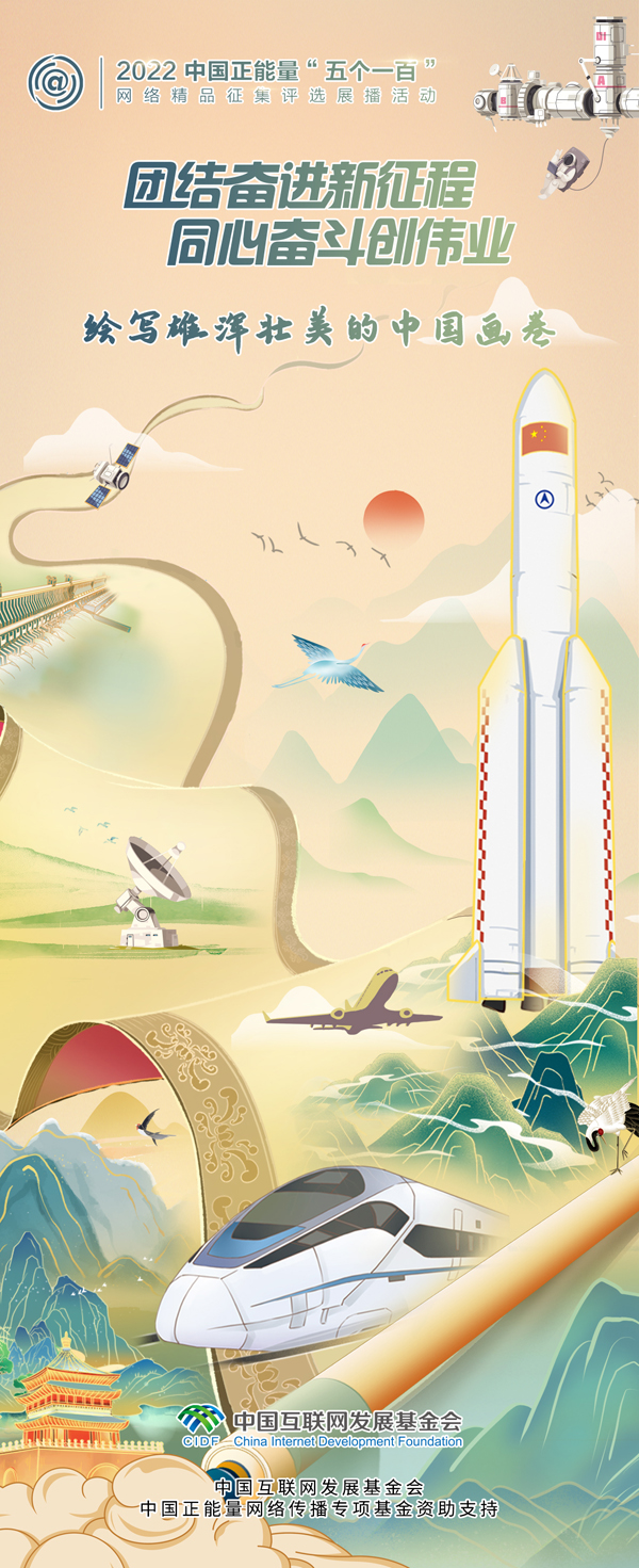 今日之中国,江山壮丽、人民豪迈,处处焕发着蓬勃的生机,升腾着发展的希望。从浩瀚苍穹,神舟十五号航天员乘组漫步太空,中国空间站全面建成后首次出舱活动圆满成功,到汽笛嘹亮、时速350公里的复兴号驰骋神州,再到中国制造,首架国产客机C919正式交付……70多年来,在14亿多中华儿女的拼搏奋斗中,中国创造了人类发展史上的奇迹。“五个一百”绘写壮丽时代的多彩卷轴,展现奋进中国的精彩图景,洋溢其中的每一份中国正能量,鼓舞人们奋发图强,再续辉煌篇章。