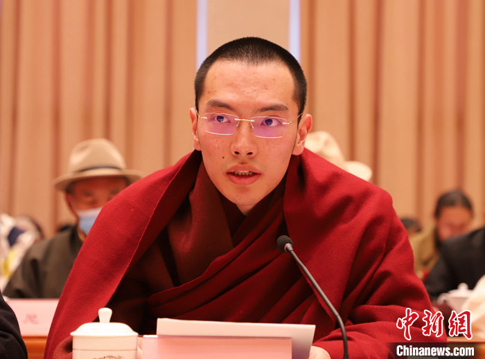 图为宗教界代表达隆夏仲·阿旺洛桑·旦增曲吉尼玛在座谈会上发言。 中新社记者 赵延 摄