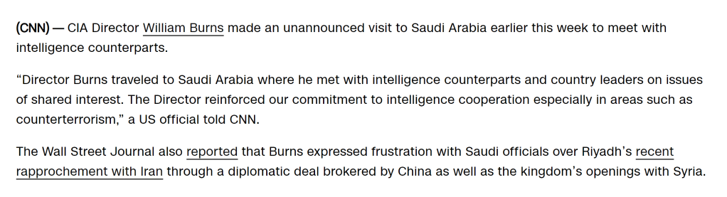 据美国有线电视新闻网报道,伯恩斯与沙特高级官员讨论了“共同利益”,包括情报合作和反恐等问题。《华尔街日报》文章称,伯恩斯对沙特接受中国斡旋与伊朗复交、沙特与叙利亚走近等表示“失望”“错愕”,重申伊朗和叙利亚仍处于美国的制裁中。