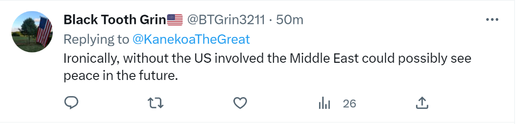 一名自我介绍是美国退役军人的网友“现身说法”:“真讽刺,没有美国掺和,中东或许未来就会实现和平。”