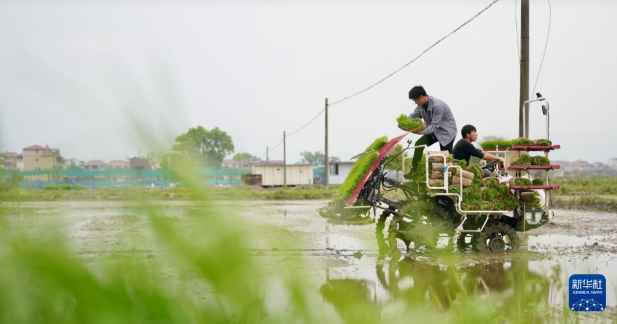4月10日,黄从明(左)在插秧机上和同事一起插秧。