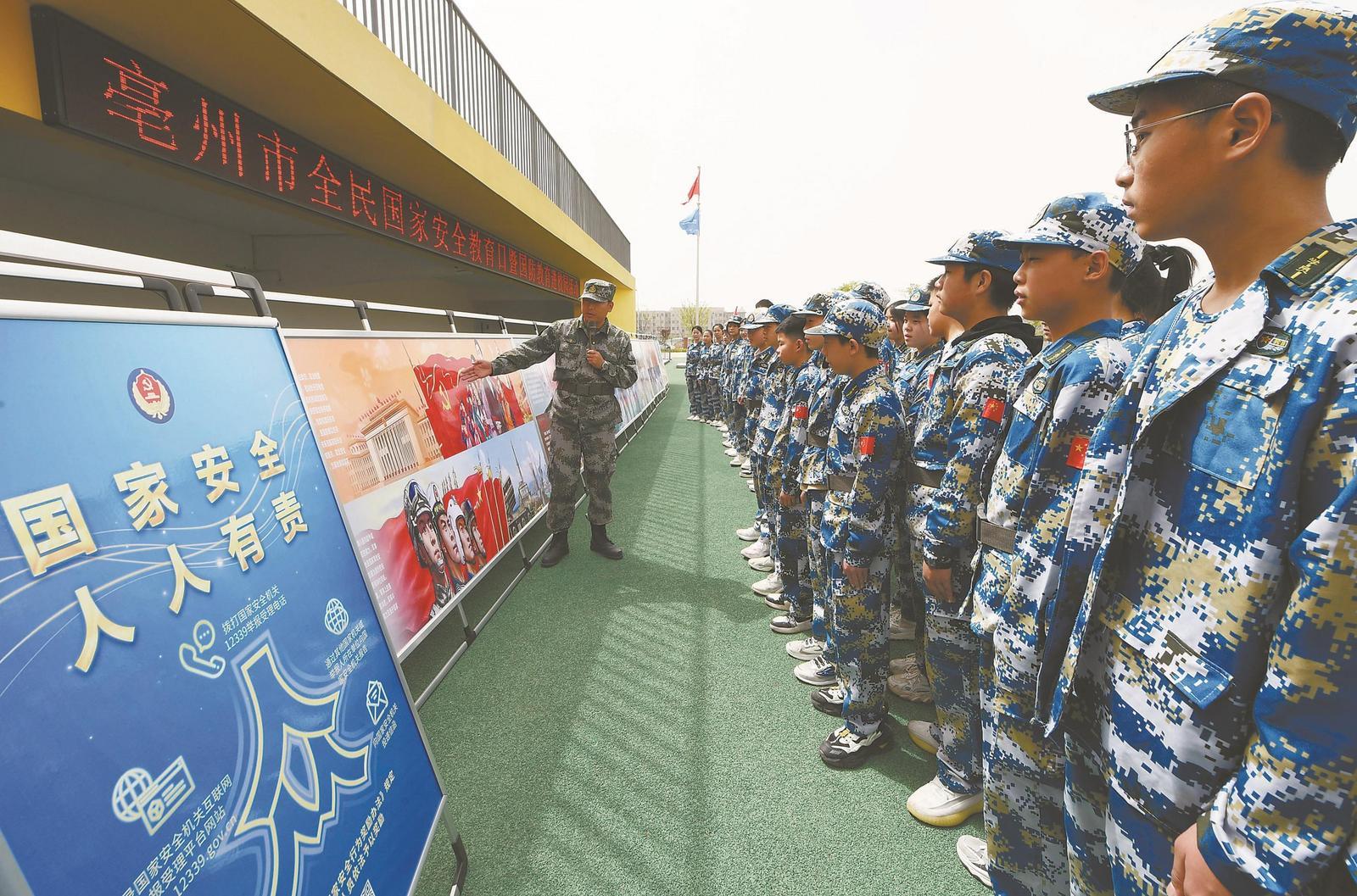 4月12日,在亳州市第三十四中学,学生们在观看国家安全知识展板。在第八个全民国家安全教育日即将到来之际,亳州市开展形式多样的主题活动,增强全民国家安全意识,共同维护国家安全。特约摄影 张延林 摄