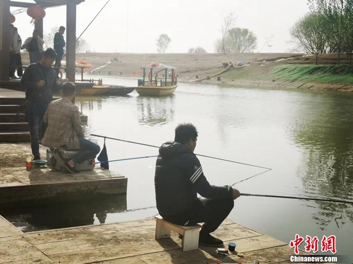 北二堡村义渡码头旁,有人在垂钓。中新网记者 谢艺观 摄