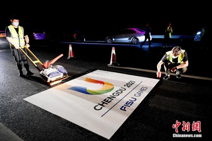 资料图:图为成都大运会专用车道地标设立现场。中新社记者 安源 摄