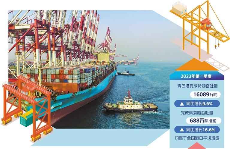 主动出击、抢抓机遇让青岛港整体实力得到不断提升。4月10日,青岛港发布2023年第一季度吞吐量公告:完成货物吞吐量16089万吨,同比增长9.6%;完成集装箱吞吐量688万标准箱,同比增长16.6%,均高于全国港口平均增速。