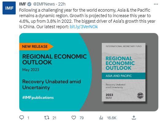 国际货币基金组织(IMF)5月2日发布的《亚洲及太平洋地区经济展望报告》中也给出了类似展望:在当下全球金融环境收紧、通胀高企以及美欧银行业危机使世界经济格局愈发复杂的背景下,中国经济加快复苏将为亚太和全球经济提供巨大动力。