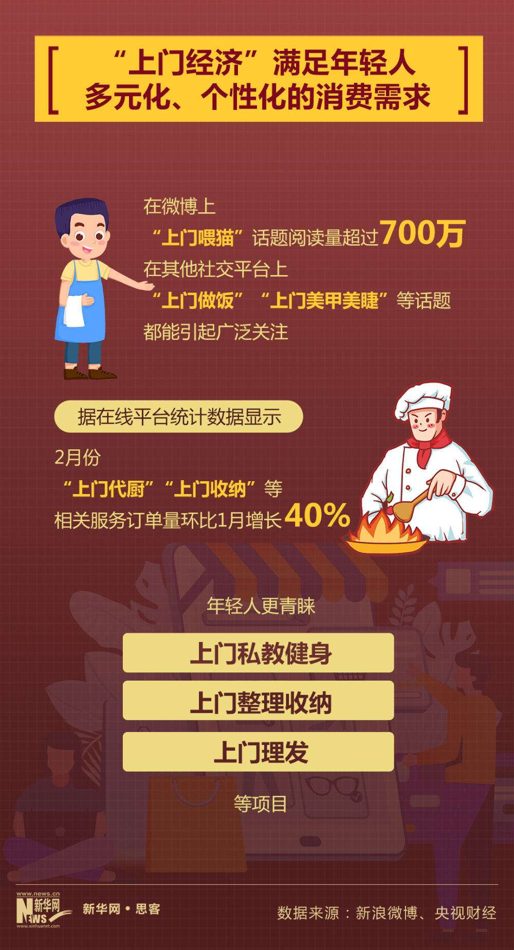 2023年春节,不少选择回老家过年的消费者,通过网络平台预约上门喂养宠物等服务。在微博上,仅“上门喂猫”话题就超过700万的阅读量;而在其他社交平台上,“上门喂猫”“上门做饭”“上门美甲美睫”等话题也都能引起广泛关注。据在线平台统计数据显示,2月份,以“上门代厨”“上门收纳”等为代表的“上门经济”快速发展,相关服务订单量环比1月增长40%。