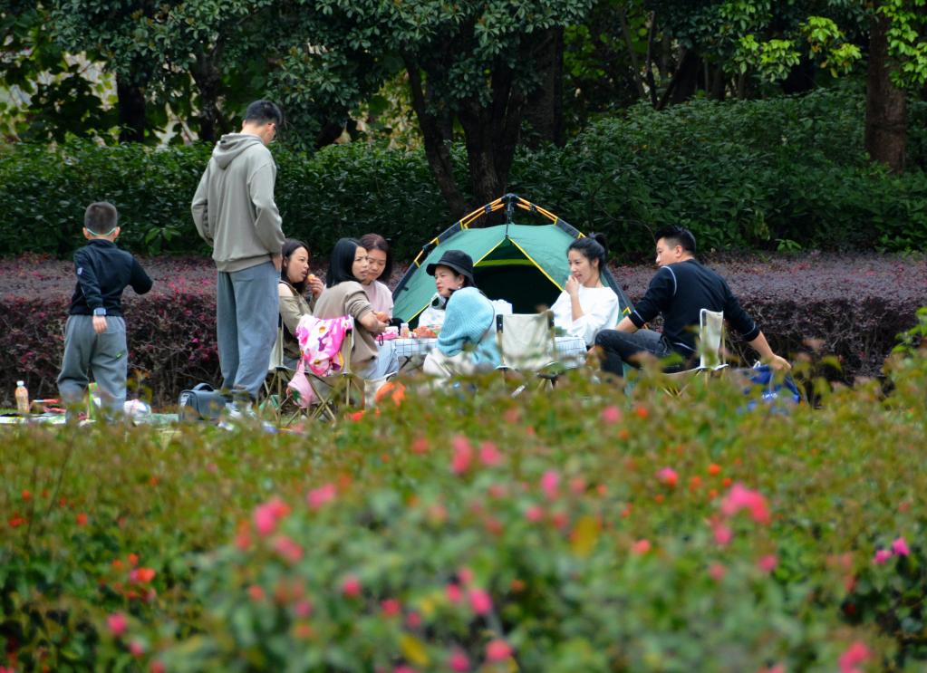 3月12日,市民在福州市花海公园周边草坪上搭起帐篷乐享周末。新华社记者 魏培全 摄