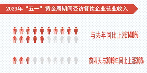 “五一”黄金周期间,受访餐饮企业营业收入比去年同期上涨149%,客流量同比去年上涨211%;今年“五一”前四天营业收入比2019年“五一”上涨26%,客流量比2019年“五一”上涨25%。