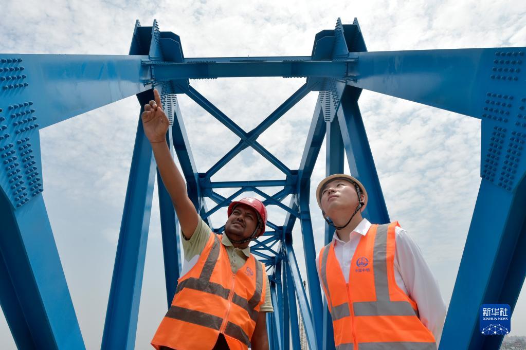 5月3日,姚尧(右)在孟加拉国达卡机场高架快速路项目上工作。新华社发