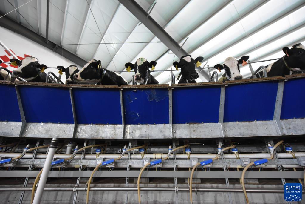 5月7日,在甘肃武威金宇浩睿农牧产业园,奶牛在转盘式挤奶机上产奶。