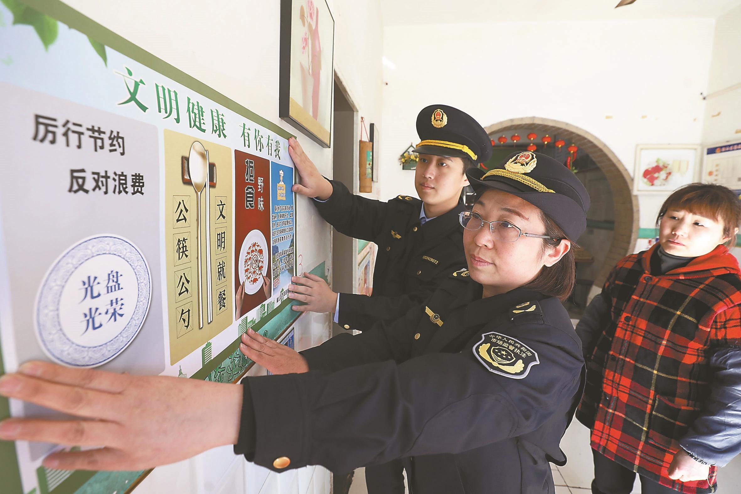 近日,淮北市相山区东山市场监管所工作人员在辖区餐饮店张贴文明就餐的宣传画和提示牌。本报通讯员 李 鑫 吴伯山 摄