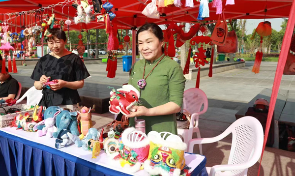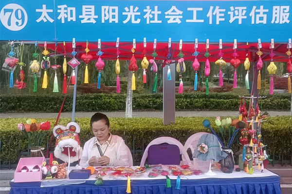 在太和县阳光社会工作评估服务中心展台上,挂满了五颜六色的香包、香囊、车载挂件,还有地方民俗文化气息浓郁的虎头鞋。工作人员孙翠萍正在向顾客介绍这些鞋头呈虎头模样的手工艺品,据了解,这些绣品都是由残疾人一针一线绣成的。2019年,包括孙翠萍在内的5位残疾人在政府的帮助下,向非物质文化遗产项目阜阳刺绣省级传承人白丽学习刺绣。他们学会刺绣后,再教给其他残疾人,不仅增加了收入,还传承了这项古老的传统手工艺。