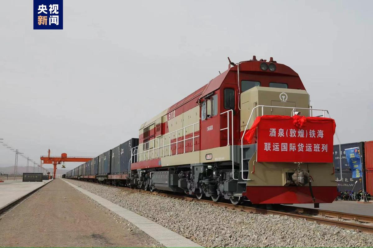5月26日,首列甘肃酒泉(敦煌)铁海国际联运班列从甘肃敦煌西铁路货场鸣笛出发,经宁波海港发往泰国首都曼谷。