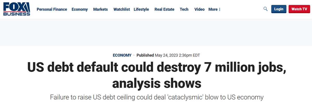 美国福克斯新闻网刊文称,美国债务违约可能导致抵押贷款利率飙升至8%以上,可能摧毁 700万个工作岗位,国内生产总值将暴跌 4%,股价将下跌近 20%,家庭财富将蒸发10万亿美元。