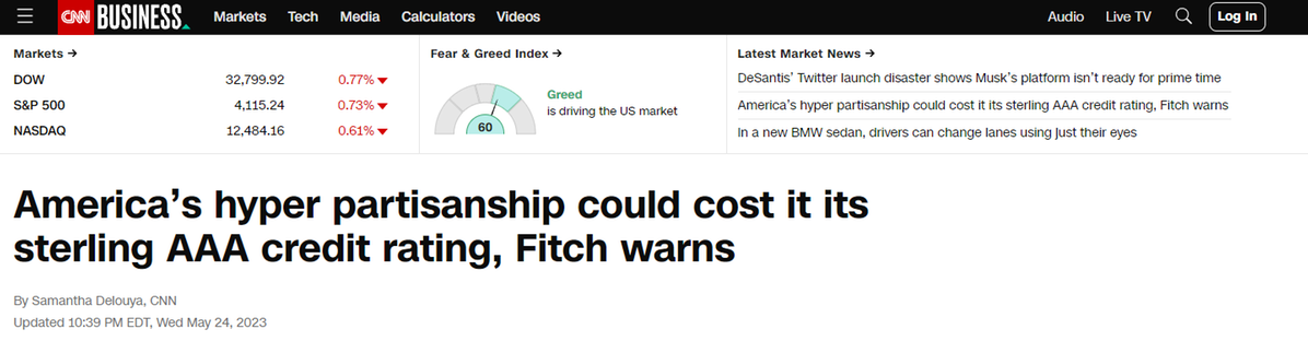 美国有限电视新闻网(CNN)援引惠誉周三发出严厉警告称,他们正在考虑下调美国信用评级,反映出围绕当前债务上限辩论的不确定性以及首次违约的可能性。