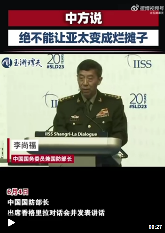 当地时间4日上午,在香格里拉对话会现场,中国国务委员兼国防部长李尚福表示,有的国家肆意插手他国的内政和地区事务,动辄单边制裁,武力胁迫,四处发动颜色革命和代理人战争。搞乱一个地区以后一走了之,留下一个烂摊子,我们绝不能让这样的事在亚太被复制。