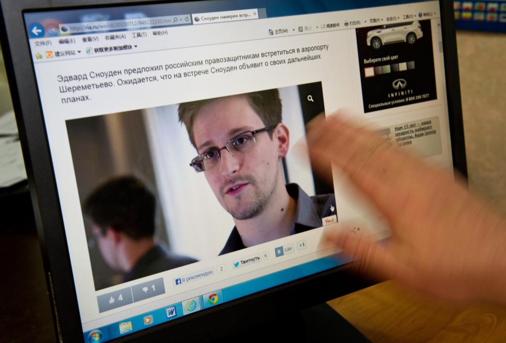 2013年7月12日,新闻工作者在俄罗斯首都莫斯科打开网页浏览斯诺登的讯息。新华社记者姜克红摄