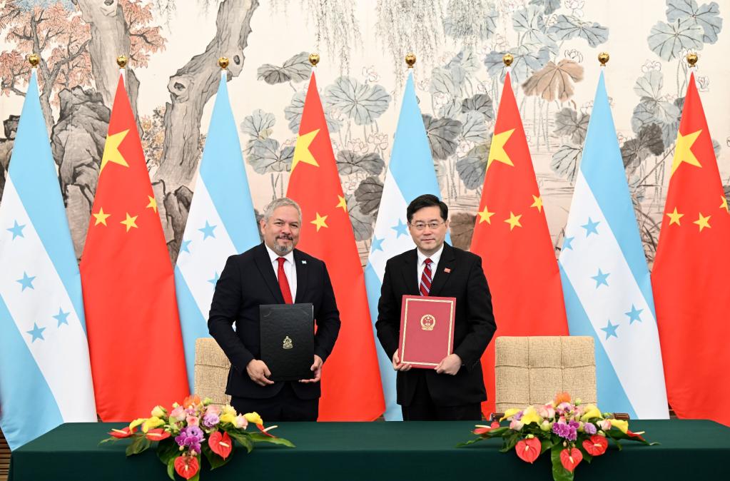2023年3月26日,国务委员兼外交部长秦刚在北京与洪都拉斯外交部长雷纳举行会谈,并签署了《中华人民共和国和洪都拉斯共和国关于建立外交关系的联合公报》。(新华社记者张领摄)