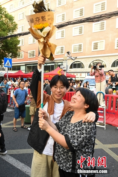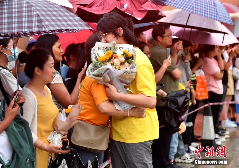 6月9日,福建省2023年高考结束,家长与考生在福州金山中学考点拥抱庆祝。