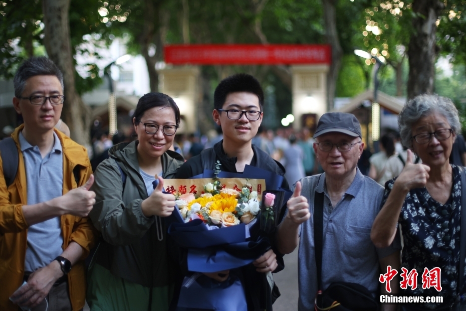 6月9日,湖北省武汉市第十四中学考点外,考生在考试结束后收到家长送上的鲜花。当日,湖北2023年高考落幕。