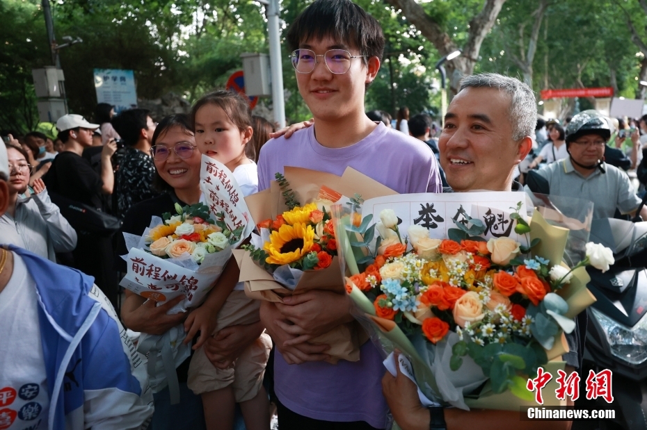 6月9日,江苏南京,家长用鲜花迎接考生。当日,江苏2023年高考落幕。
