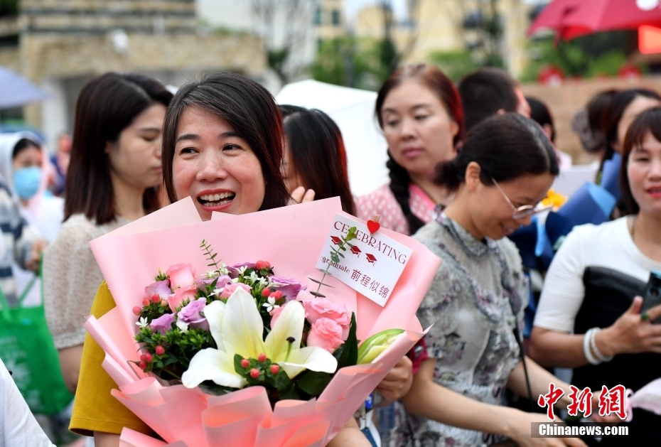 6月9日,福建省2023年高考结束,家长手持鲜花在福州金山中学考点迎接考生。