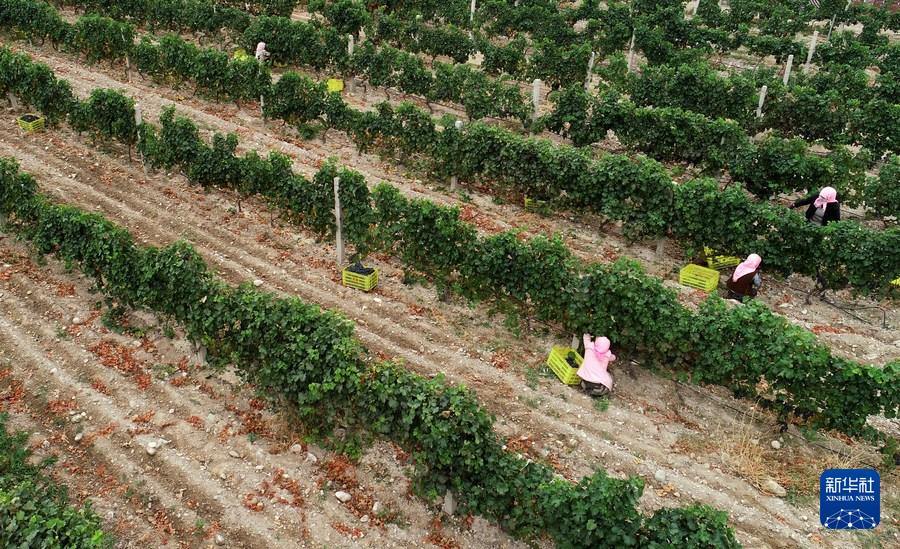 2022年9月16日,工人在宁夏银川市贺兰山东麓的沃尔丰酒庄采摘酿酒葡萄。新华社记者 王鹏 摄