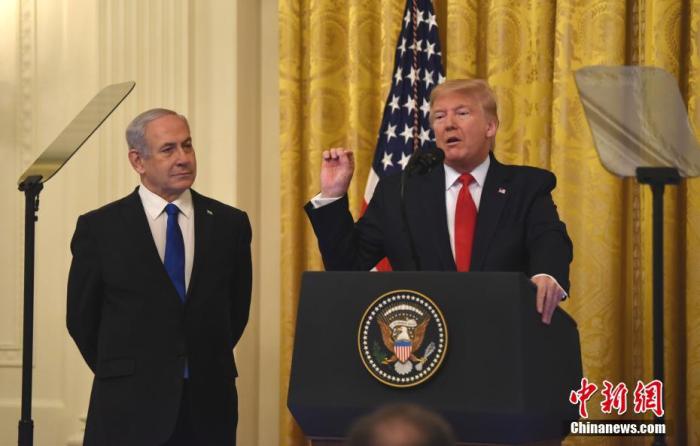 资料图:当地时间2020年1月28日,时任美国总统特朗普和以色列总理内塔尼亚胡在白宫举行联合发布会,宣布所谓推动解决巴勒斯坦与以色列问题的“世纪协议”。巴勒斯坦方面此前已表示,该协议违反国际法,呼吁国际社会予以拒绝。中新社记者 陈孟统 摄