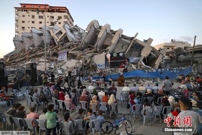 资料图:当地时间2021年6月2日,加沙地带,巴勒斯坦音乐家在遭受以色列空袭的房屋废墟上演奏音乐。