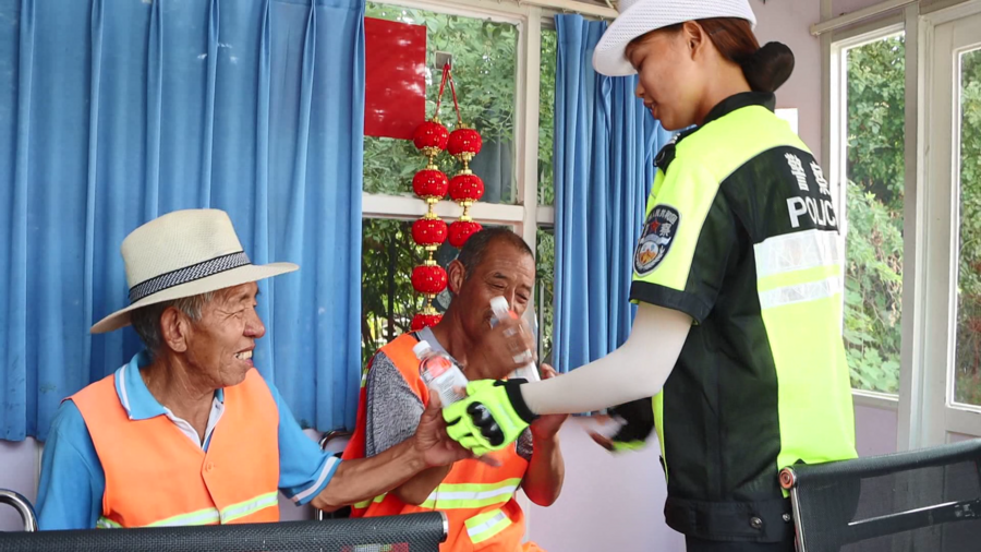 在邯郸市肥乡区,沿街警务室向环卫工人和快递工作人员开放,并提供饮用水、西瓜和防暑药品。
