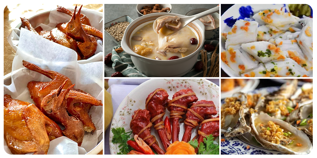 吃:光明乳鸽、猪肚包鸡、沙井生蚝等