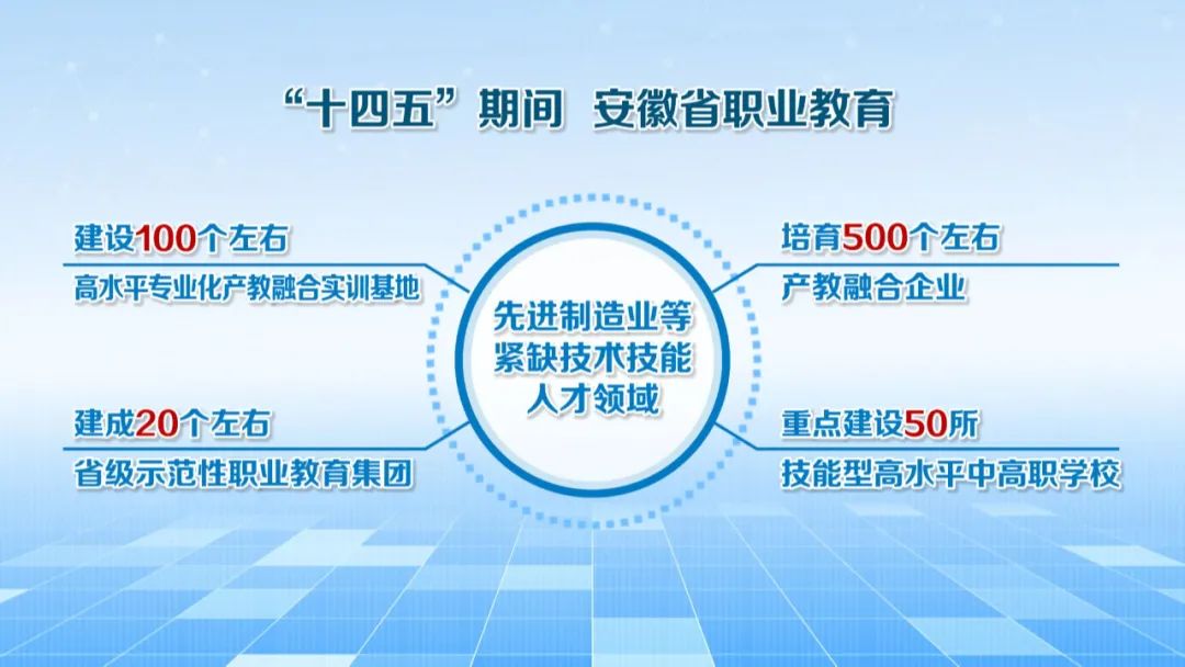 十四五期间,我省将面对先进制造业等紧缺技术技能人才领域,建设100个左右高水平专业化产教融合实训基地,培育500个左右产教融合企业,建成20个左右省级示范性职业教育集团,重点建设50所技能型高水平中高职学校。深化产业学院建设,围绕区域产业发展,重点打造一批紧密对接产业的特色高水平专业群。