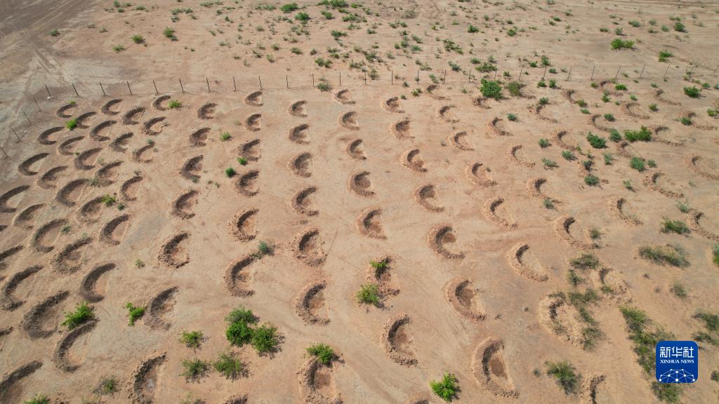 他指着面前一个个半月形土坑说,这种形状的土坑方便蓄水,有利于树苗生长。他和志愿者刚种下一棵小树苗,给这片沙地增添了一抹嫩绿。
