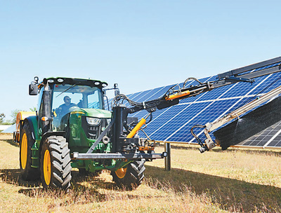 记者采访时,阿尔科雷斯光伏电站正在进行每半年一次的设备清洁。一辆重型清洁车来回穿梭,不到1小时就完成了约200块光伏板的清洁工作(见上图。本报记者颜欢摄)。运维技术人员何塞·罗丹向记者展示:只需轻轻点击手机上的控制程序,将界面上的“自动”模式切换成“清洁”模式,眼前的光伏板便开始缓缓旋转,达到程序设定的倾斜角度,随后开始清洗流程。