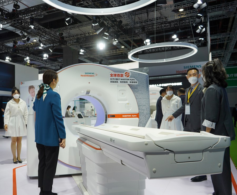 2022年11月5日,在第五届进博会医疗器械及医药保健展区,观众在西门子展台参观展出的光子计数CT扫描仪。(新华社记者金皓原摄)