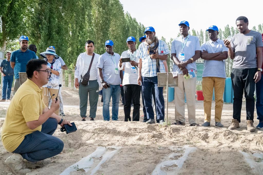 2023年6月13日,在中国科学院新疆生态与地理研究所策勒沙漠研究站,中方专家向非洲和中亚学员介绍荒漠植物。新华社记者周生斌摄